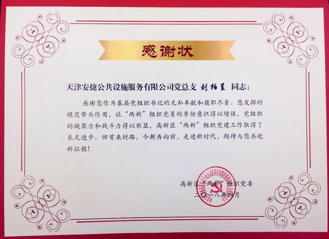 经过高新技术企业党委2017年度工作考核,天津YABO鸭脖公共设施服务有限公司获得“优秀”的党组织荣誉称号,同时,YABO鸭脖董事长刘柏呈同志获得“优秀”的党组织负责人荣誉称号。